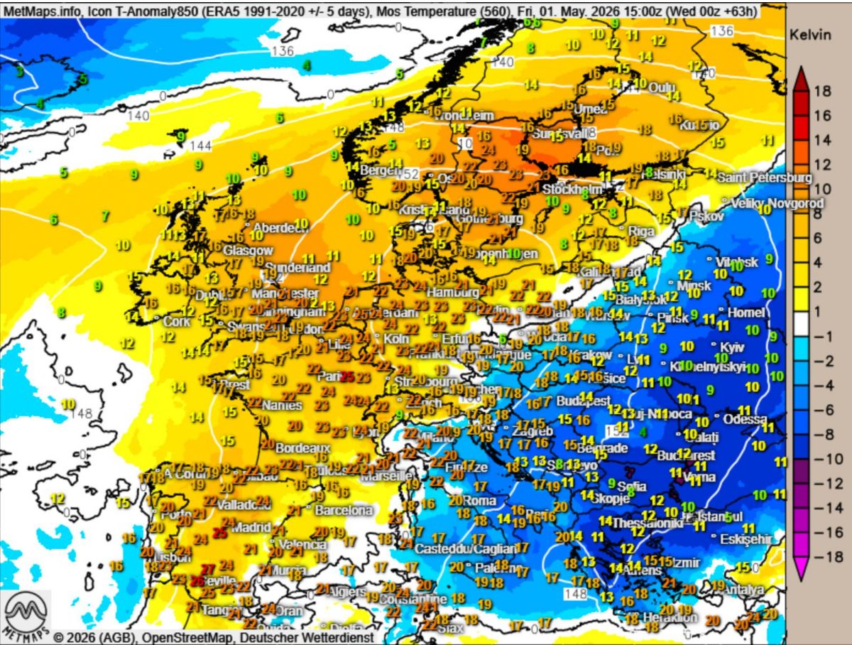 Temperaturabweichung und Temperatuen 01.05. (15:00 Uhr) nach Icon