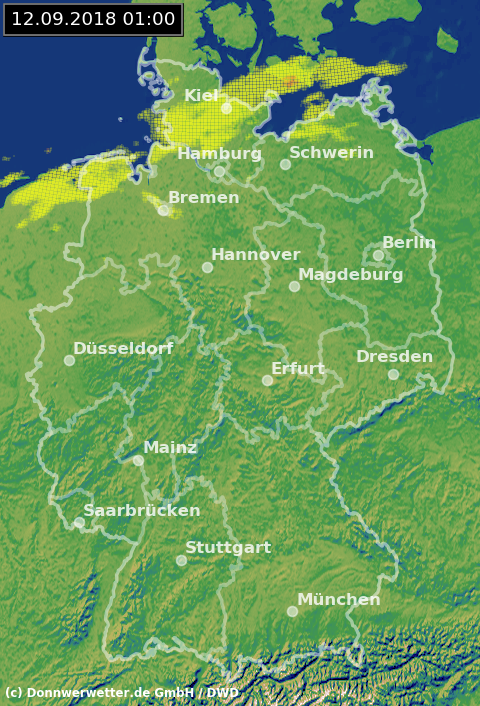 Am Donnerstag erreicht die schwache Kaltfront auch die mittleren und südlichen Landesteile in Form örtlicher Regengüsse und einzelner Gewitter. Die Niederschlagsmengen liegen dabei allgemein zwischen 1 und 10 Liter pro Quadratmeter, in kräftigeren Schauern auch darüber. Im nördlichen Schleswig-Holstein kann es gelegentlich etwas regnen.