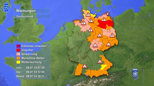 Starke Gewitter ziehen von Brandenburg nach Mecklenburg-Vorpommern. In weiten Teilen Deutschlands regnet es noch immer, seit Montag Abend sind zum Beispiel am Köln/Bonner-Flughafen über 30 Liter pro Quadratmeter gefallen, in Meiningen 35 Liter, und in Freudenstadt sogar über 40 Liter. Da es auch heute Nacht und morgen noch teilweise kräftige Regenschauer gibt, sind lokale Überflutungen weiterhin möglich.