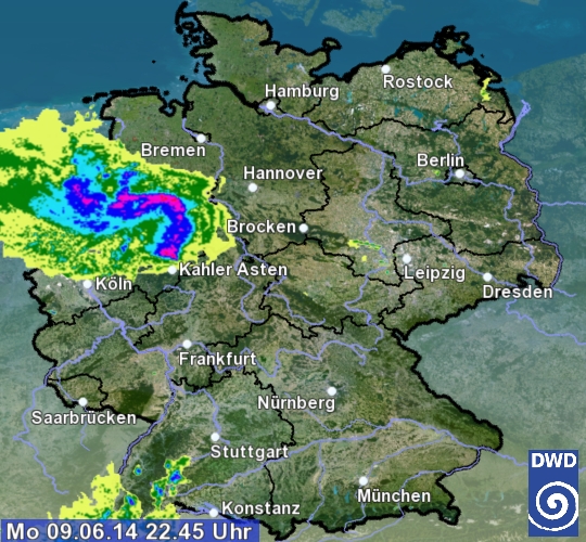 Das Radarbild von 22:45 Uhr zeigt die starken Gewitterzellen, die von Südwesten nach Nordosten in Richtung Niedersachsen ziehen: