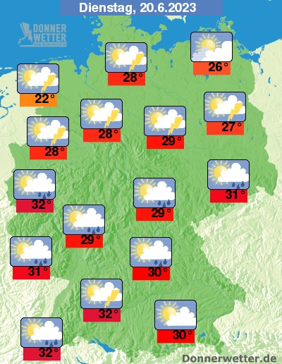 Die nächste Staffel folgt dann am Dienstagabend bzw. in der Nacht auf Mittwoch. Nach einem schwül-heißen Dienstag mit Temperaturen bis 32 Grad sind dann teils kräftige Schauer möglich. Besonders für Baden-Württemberg besteht Unwettergefahr; aber auch im westlichen NRW sind lokale Unwetter möglich. Wie in der Nacht zuvor ziehen die Schauer- und Gewittergebiete dann ostwärts ab und verlieren an Kraft.
