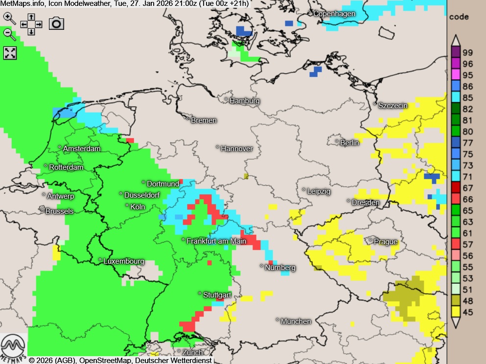 Entlang einer Luftmassengrenze, die sich vom Emsland über Ostwestfalen-Lippe bis nach Nordhessen und weiter nach Franken erstreckt, fällt verbreitet Schnee, lokal ist auch Eisregen möglich. Dadurch besteht regional erhöhte Glättegefahr.