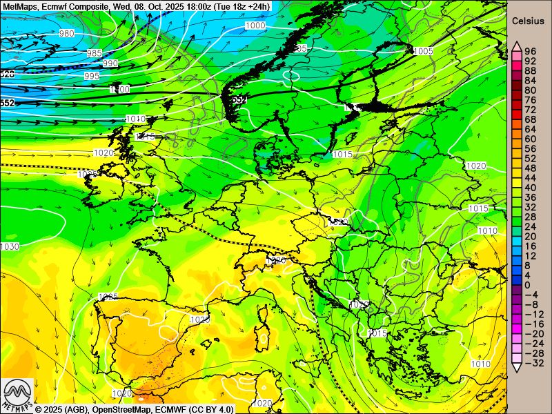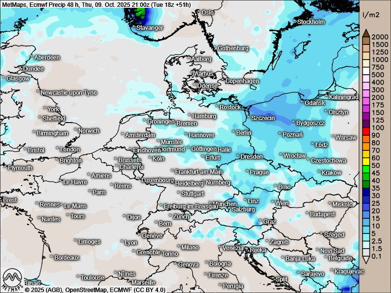 Die Strömung für Mittwochabend sowie die 48-Stunden-Regenmengen bis Donnerstagabend nach ECMWF: