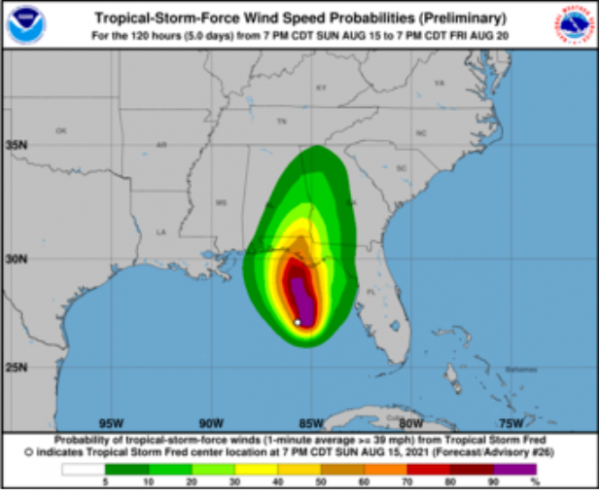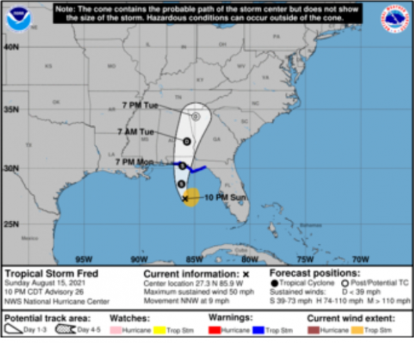 Ein weiterer Tropensturm bewegt sich aktuell in Richtung Golfküste des US-Bundesstaates Florida zu: "Fred"  trifft voraussichtlich am Montagabend (Ortszeit) auf Land, zunächst ist der Nordwesten Floridas von starken Winden und kräftigen Regenfällen sowie lokalen Überflutungen betroffen. Bis Dienstagabend zieht "Fred" dann weitere über Teile von Alabama und Georgia - zuletzt mit einer Geschwindigkeit von etwa 19 Kilometern pro Stunde.