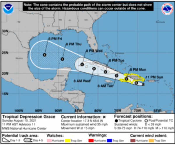 Tropensturm "Grace" wurde vom Hurrikanzentrum in Miami zwar heruntergestuft, dennoch sind am Montag extreme Regenfälle möglich - im Fokus besonders die Dominikanische Republik, Puerto Rico sowie Haiti.