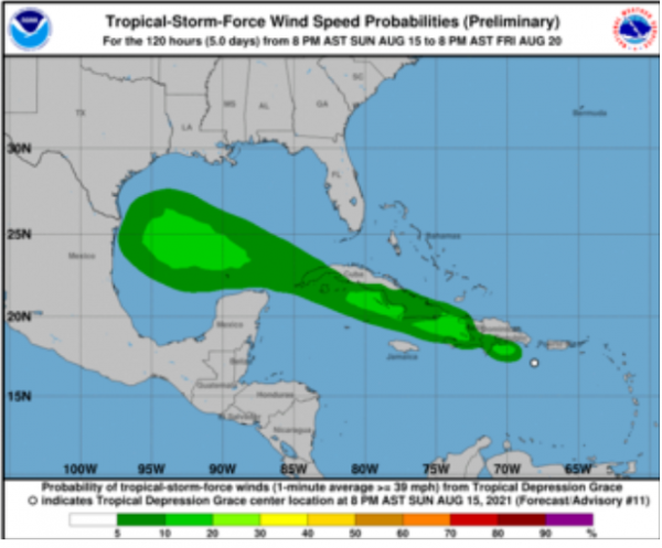 "Grace" - Wahrscheinlichkeiten für Tropenwindstärke (Ein-Minuten-Mittel >=68 km/h)