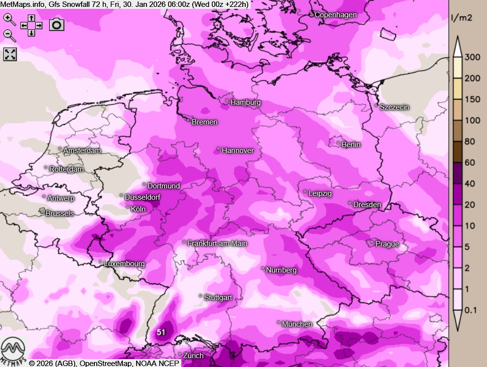 Vor allem das Wettermodell GFS berechnet eine markante Grenzlage über Mitteleuropa. Diese könnte Schnee, Eisregen und Regen bringen – begleitet von Temperaturunterschieden von teils über 10 °C in Mitteleuropa.