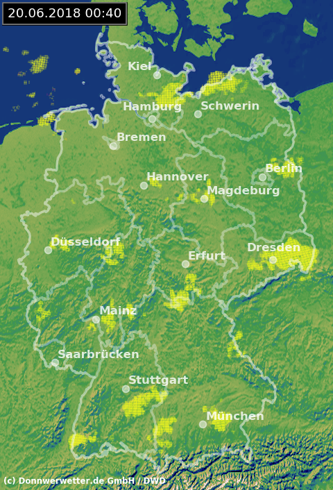 Am Donnerstag überquert uns von Nordwest nach Südost eine Kaltfront. Dabei werden vor allem im Norden, sowie in den Gebieten südlich der Donau Regenfälle und örtliche Gewitter ausgelöst. Die Mengen liegen dabei allgemein zwischen 1 und 15 Liter pro Quadratmeter, zum Teil auch mehr.