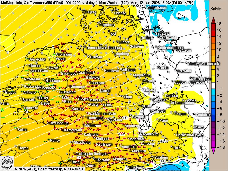Die Temperaturanomalien kombiniert mit den bodennahen Wettervorhersagen aus dem MOS nach GFS sowie die 24-Stunden-Niederschlagsmengen für Montag nach ICON: