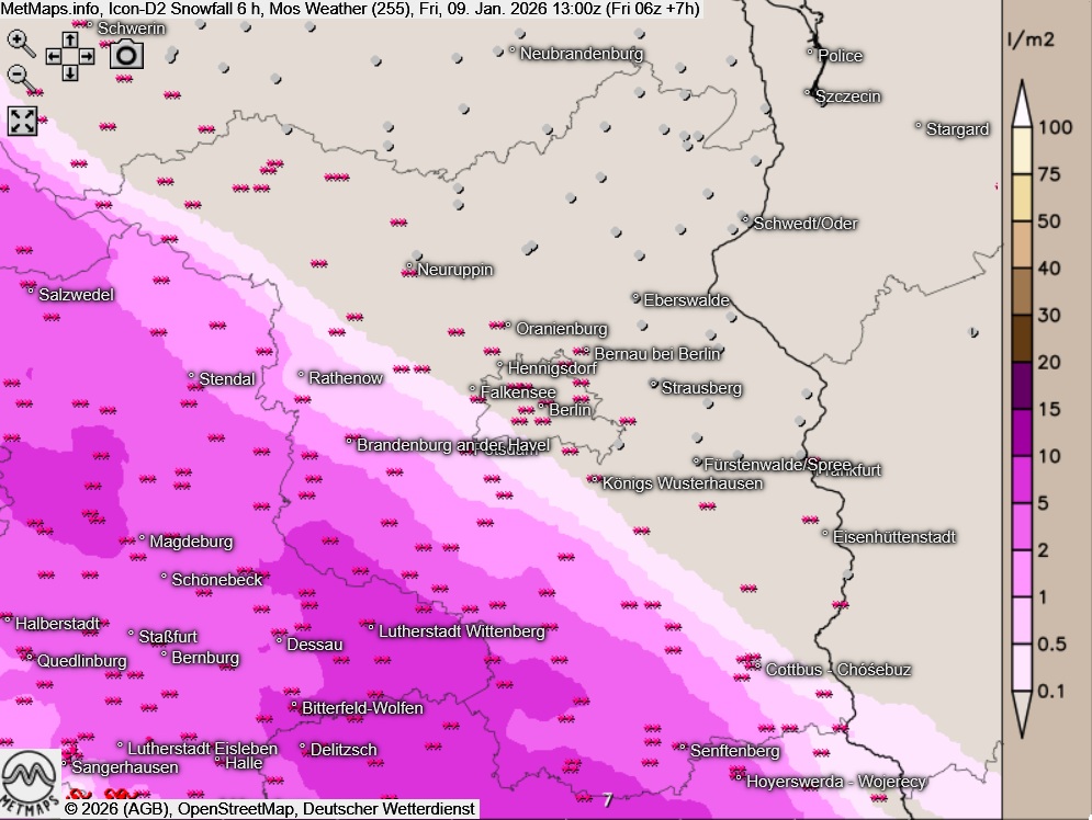 Die 3-Stunden-Schneemengen / Wetter für Deutschland sowie die Sechs-Stunden-Schneemengen für Berlin bis 13:00 Uhr nach ICON-D2: