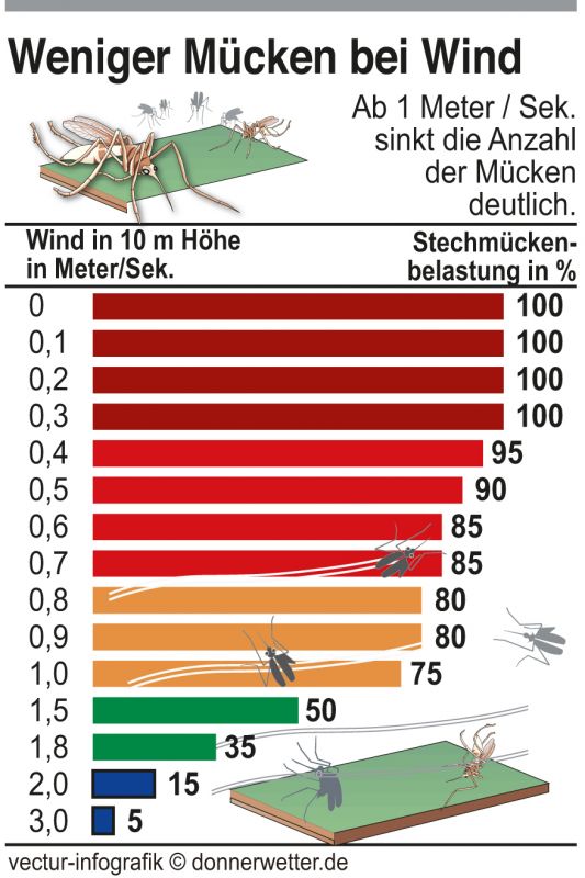 Mit einer durschnittlichen Fluggeschwindigkeit von 0,3 bis 0,6 m/s lieben Stechmücken übrgens vor allem windstille und warme Tage ohne direkte Sonneneinstrahlung (s. Grafik links). Wind dagegen können sie so gar nicht leiden.