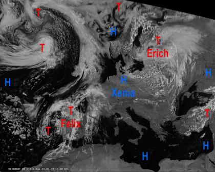 Auf dem heutigen Satellitenfoto zeigt sich ein ausgeprägtes Tiefdruckgebiet mit vielfach dichten Wolken über Osteuropa. Es kommt zu häufigen Schauern, teils auch zu einzelnen Gewittern. Auch über Spanien befindet sich ein Tief, das dort bei wechselnder bis starker Bewölkung zu Schauern oder Gewittern führt. Besonders nach Süden und Osten ist es aber häufig auch freundlich und trocken. Weitere Tiefdruckgebiete bringen in Westfrankreich und über Großbritanien Schauer und vereinzelte Gewitter. Sonst ist es in Europa aber überwiegend freundlich und auch trocken.