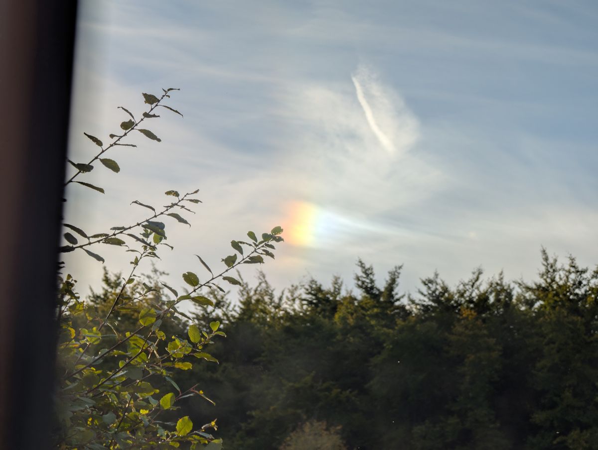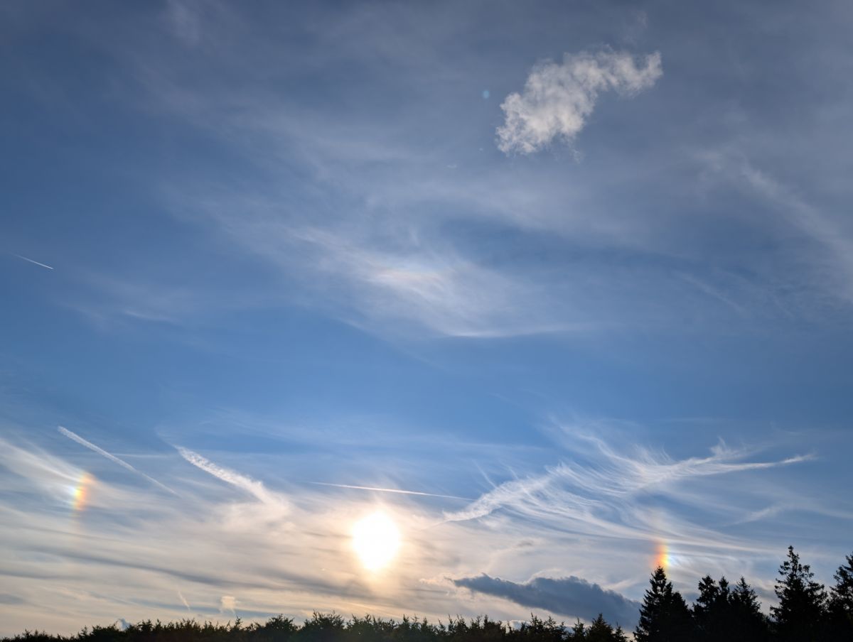 Die Fotos zeigen Nebensonnen und Zirkumzenitalbogen gestern Abend über dem donnerwetter.de-Wetterpark in der Eifel. Ein Video findet Ihr auf Facebook und TikTok.
