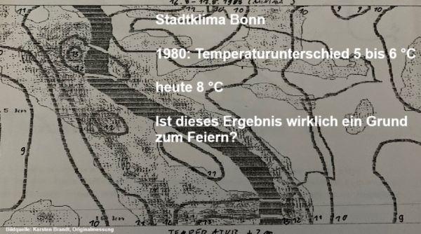 Karsten Brandt: „Das Problem ist, dass valide Daten zur maximalen Wärmeinselintensität nur sehr mühsam zu ermitteln sind. In Bonn sehen wir in Wirklichkeit keine nennenswerte Verbesserung der Wärmeinselintensität, seit den 1990er- und 2000er-Jahren ist sie hier stetig angestiegen. Von fünf bis sechs Grad in den 1980er-Jahren bis auf acht Grad in den 2020er-Jahren.“