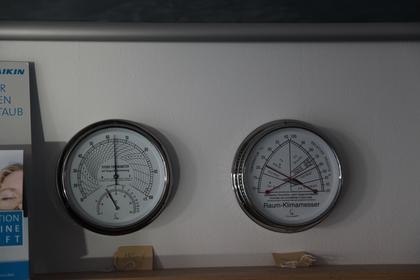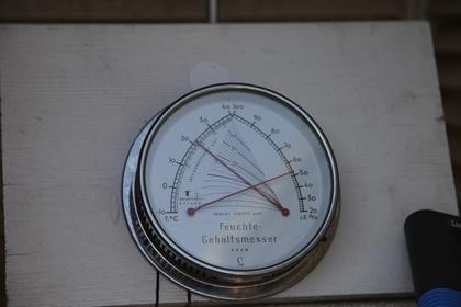 Während in den meisten Wohnungen in Deutschland die Temperaturen auf 26 bis 30 Grad C geklettert sind und so manche Dachwohnung zur Sauna verkommt, kann man es in den höchsten Lagen der Mittelgebirge aushalten. Auf fast 700 m Höhe am Weißen Stein in der Eifel liegen die Raumtemperaturen bei 21 bis 23 Grad C (siehe Photo- Raumtemperaturmessgeräte), nach einer Nacht mit 21 Grad C Außentemperatur.