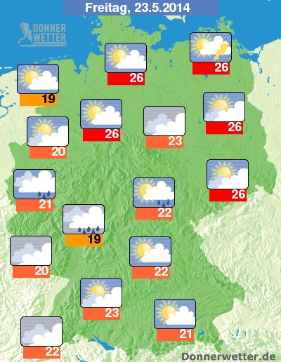 Örtliche Schauer und dichte Wolken sind am Freitag vor allem im Westen und Teilen der Mitte zu erwarten. Wo es schauert, kommen die Temperaturen stellenweise nicht über die 20 Grad C hinaus. Im Nordosten wird es nochmal richtig warm, Höchstwerte um 26 Grad.