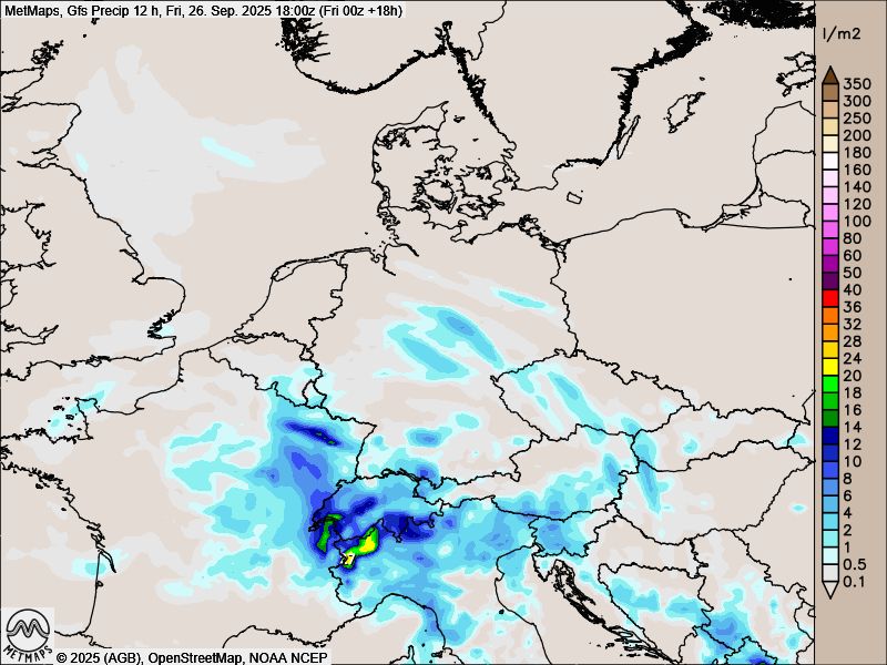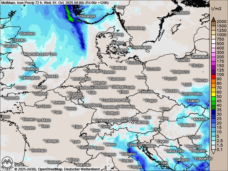 Die Wetter- und Niederschlagskarte für Freitag (GFS), die Lufttemperaturen am Sonntagnachmittag (Icon) sowie die 72-Stunden-Regenmengen bis Anfang Oktober: