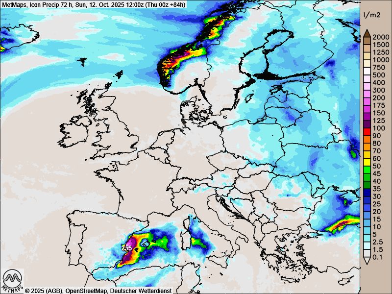 Die Strömungskarte und die Temperaturanomalie am Montagnachmittag sowie die 72-Stunden-Regenmengen bis Sonntagmittag nach Icon: