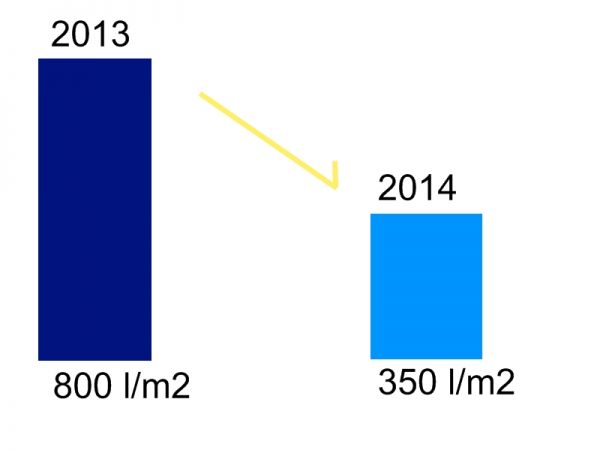Die aktuelle Wetterlage wird keine Hochwassergefahr an den großen Flüssen, wie Elbe, Rhein oder Main bedeuten. Die folgende Abbildung zeigt die Wassermenge in der Mitte Deutschlands im Boden im Jahr 2013 und Jahr 2014.