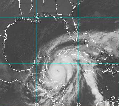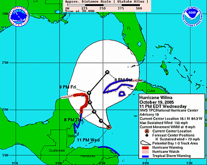 Satellitenbild von Donnerstag vormittag'Wilma' zieht zur Zeit nur mit 11 Kilometern pro Stunde weiter in Richtung Norden und wird am Freitag die Straße von Yucatan zwischen Kuba und der mexikanischen Halbinsel Yucatan passieren. Wahrscheinlich wird er dabei dem mexikanischen Festland sehr nahe kommen. Während für Yucatan eine Hurrikan-Warnung besteht, wurde für Kuba nur eine Warnung vor einem Tropensturm ausgegeben.