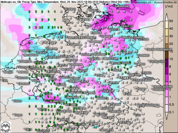 Die Karte zeigt die Temperaturen heute Abend (18:00 Uhr) sowie die zu erwartende Niederschlagsmenge und -form. Schneeschauer sind in pink dargestellt.
