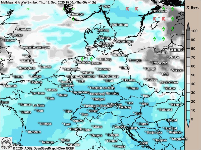 Die Wetterkarte sowie die Europatemperaturen am Donnerstagnachmittag und die Lufttemperaturen in Deutschland am Freitagnachmittag nach GFS: