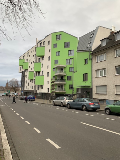 Der luxuriöse Neubau an Beethoven Jugendhaus in der Rheingasse 24. Die Straße lag einst tiefer und wurde vom Hochwasser vollständig überschwemmt. Durch den Kriegsschutt liegt die Straße heute höher.