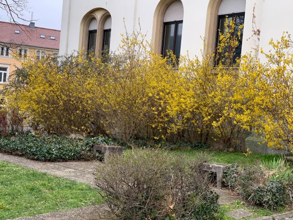 Deutlich weiter ist da schon die Blüte der Forsythie. Übrigens: Ein verlässlicher Indikator dafür, wann der Wintermantel von Rosenstauden entfernt werden kann, ist übrigens die einsetzende Blüte der Forsythie.