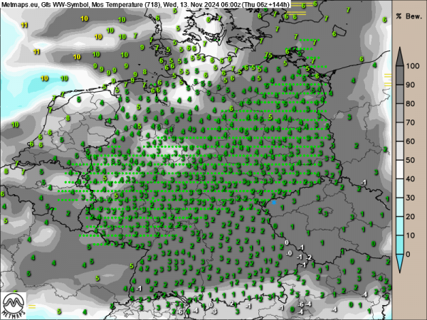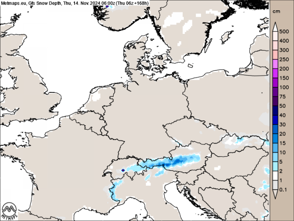 Die folgenden Karten zeigen die durch das US-amerikanische GFS-Modell prognostizierte Schneehöhe für den kommenden Donnerstag, 14. November sowie die Wetterkarte für Deutschland für den kommenden Mittwoch, 13. November.