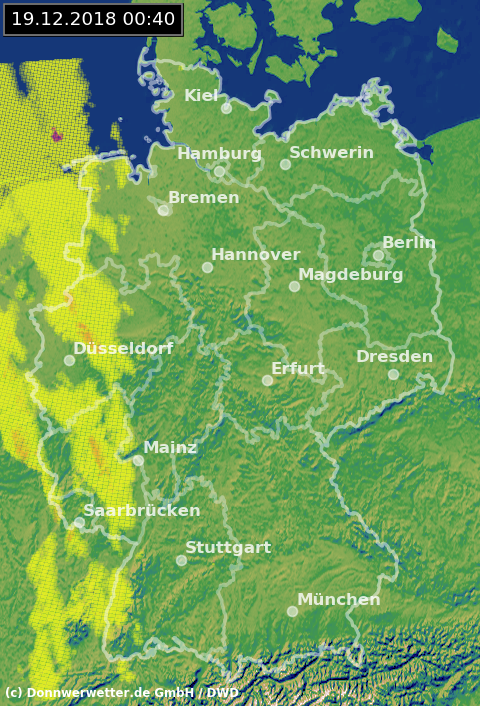 Das Radarbild zeigt aktuell im Westen erste leichte Signale einer nahenden Front, Regen fällt daraus aber derzeit noch nicht. Sonst präsentiert sich der Himmel über Deutschland im Westen eher wolkenverhangen im Osten teilweise aufgeklart. Stellenweise haben sich hier auch Nebelfelder gebildet.