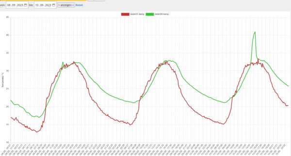 Die grüne Kurve bildet den Temperaturverlauf für den Zeitraum 08.09. - 10.09.2023 auf dem Marktgelände ab. Die rote Kurve ist der Vergleichswert - gemessen nur wenige hundert Meter entfernt an unserer Wetterstation und fernab des Trubels.