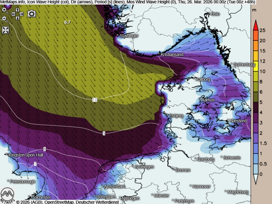 Mit dem Durchzug der Kaltfront des Sturmtiefs „Livia“ baut sich auf der Nordsee eine markante und teils gefährliche Seegangslage auf. Vor allem auf der offenen See werden signifikante Wellenhöhen von bis zu rund 8 bis 10 Metern berechnet, örtlich sind sogar noch höhere Einzelwellen möglich.