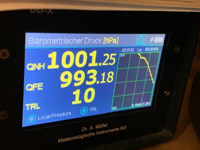 Zuletzt pendelte sich der Wert auf etwa 1001 QNH (auf Meereshöhe berechneter Luftdruck) ein. Mit Durchzug der Kaltfront geht es mit den Werten nun nochmals etwas nach unten.