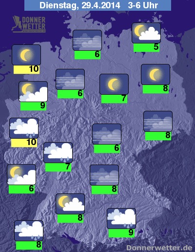 Die Temperaturen sinken in der Nacht auf Tiefstwerte um 10 Grad im Westen und um 5 Grad im Nordosten.
