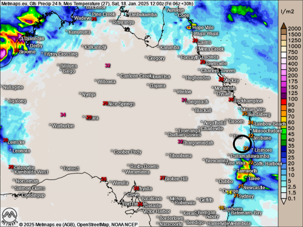 Niederschlagssummen Australien 18.01. (12 Uhr), schwarz umkreist der ungefähre Standort des Camps.