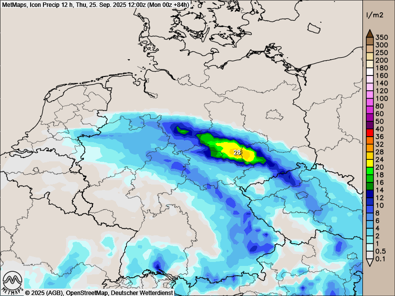 Die 12-Stunden-Regenmengen bis Mittwoch- und Donnerstagmittag (12:00 Uhr) nach ICON.