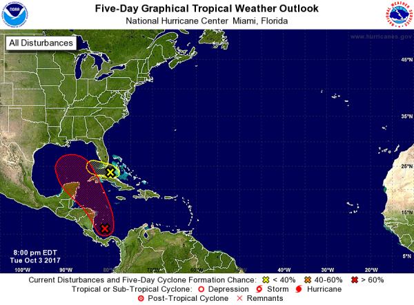 Ein weiteres schweres Sturmgebiet mit hohem Hurrikanpotential bildet sich aktuell im Karibischen Meer vor den Küsten Panamas und Costa Ricas. Die Wahrscheinlichkeit einer Tropensturmformation gibt das staatliche Hurrikancenter zur Zeit mit 70 % in den kommenden 48 Studen bzw. 80 % in den nächsten fünf Tagen an (siehe rote Fläche auf der Karte).
