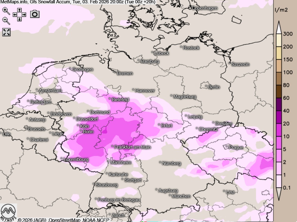 Im Folgenden die Unwetterwarnkarte, die Wetterkarte für 14:00 Uhr sowie die akkumulierten Schneemengen bis 20:00 Uhr nach GFS: