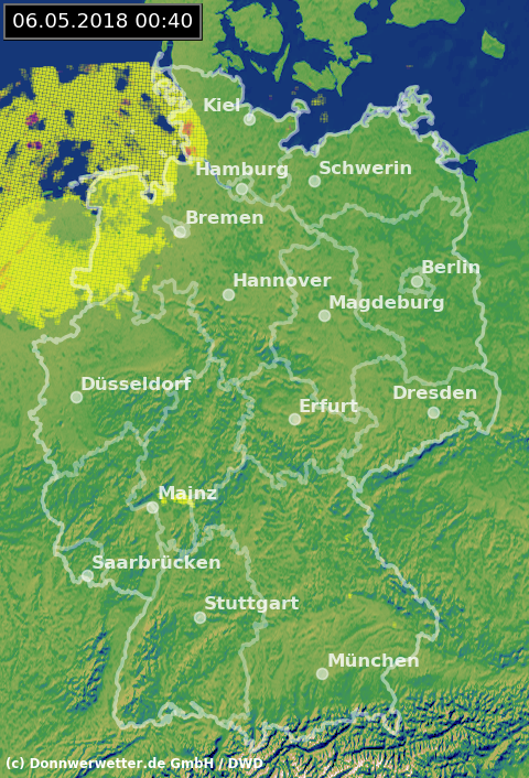 Das Radarbild zeigt aktuell zwar Signale im Nordwesten. Hierbei handelt sich aber um fehlerhafte Signale die nicht auf Niederschlag deuten. Der Himmel über Deutschland präsentiert sich überwiegend sternenklar oder nur leicht bewölkt.