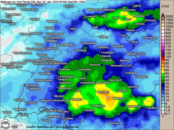 Für Thüringen und Sachsen werden, wie gestern schon erwartet, nicht mehr extremste Mengen berechnet; durch Gewitter sind in den nächsten Stunden allerdings auch hier lokal bis zu 50 l/m² neuer Niederschlag in 12 Stunden möglich, so dass es zumindest stellenweise Probleme mit vollgelaufenen Kellern und Unterführungen geben kann. Lokale Schauer und Gewitter bescheren Teilens Sachsens und Thüringens in der Nacht auf Sonntag nochmals 20 bis 30 l/m².