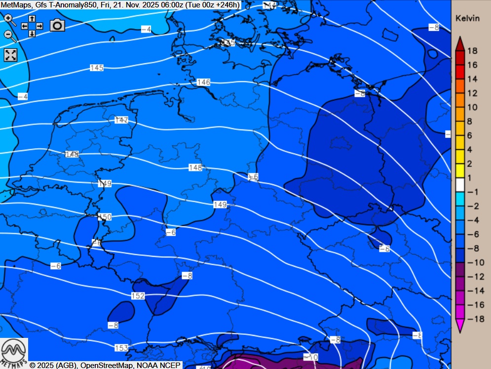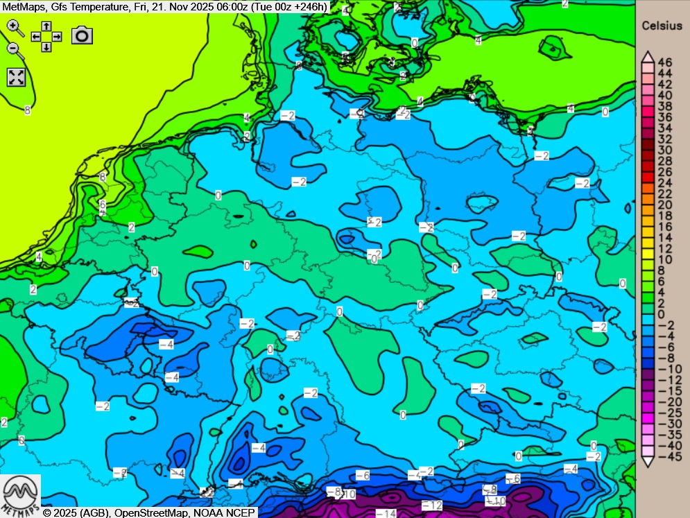 Die Lufttemperaturen sowie die Temperaturabweichung nach GFS am übernächsten Freitag (21.11.2025, 06:00 Uhr):