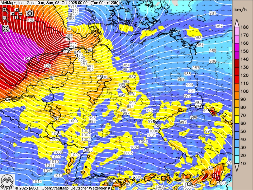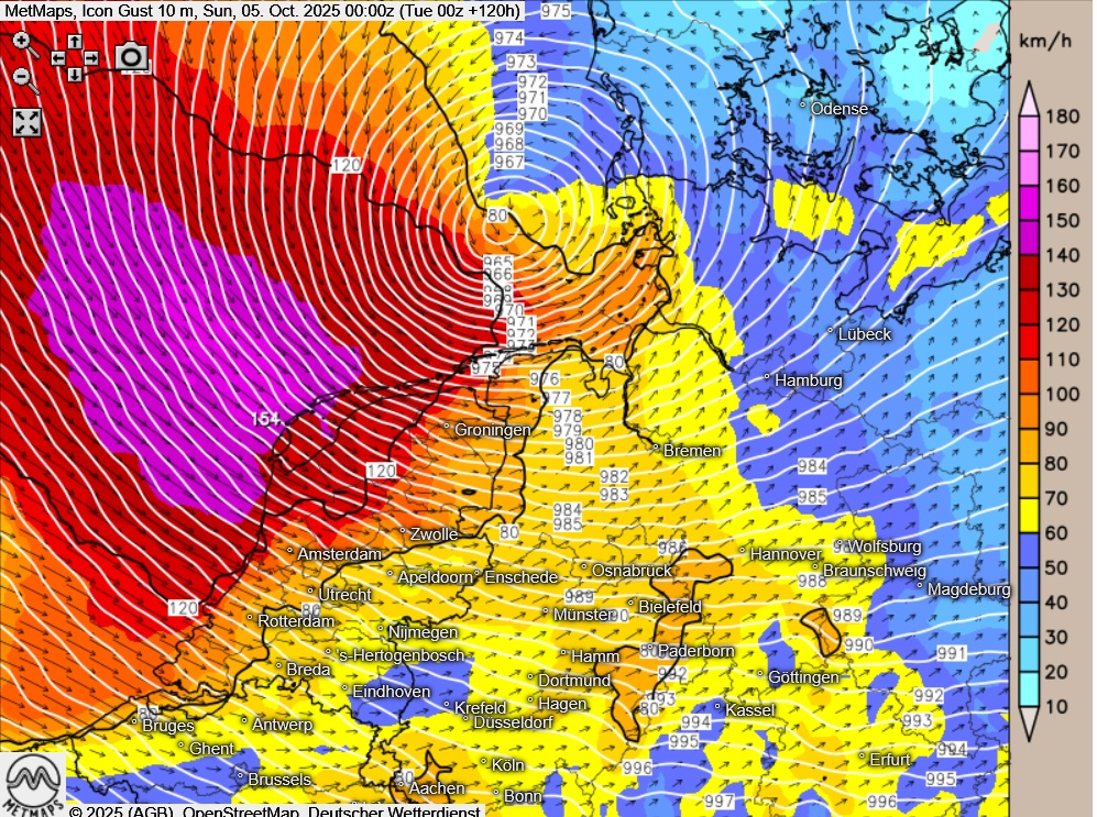 Die aktuellen Böenkarte nach Icon für die Nacht zum Sonntag für Deutschland und die vergrößerte Karte für den Norden/Nordwesten Deutschlands sowie die Niederlande.