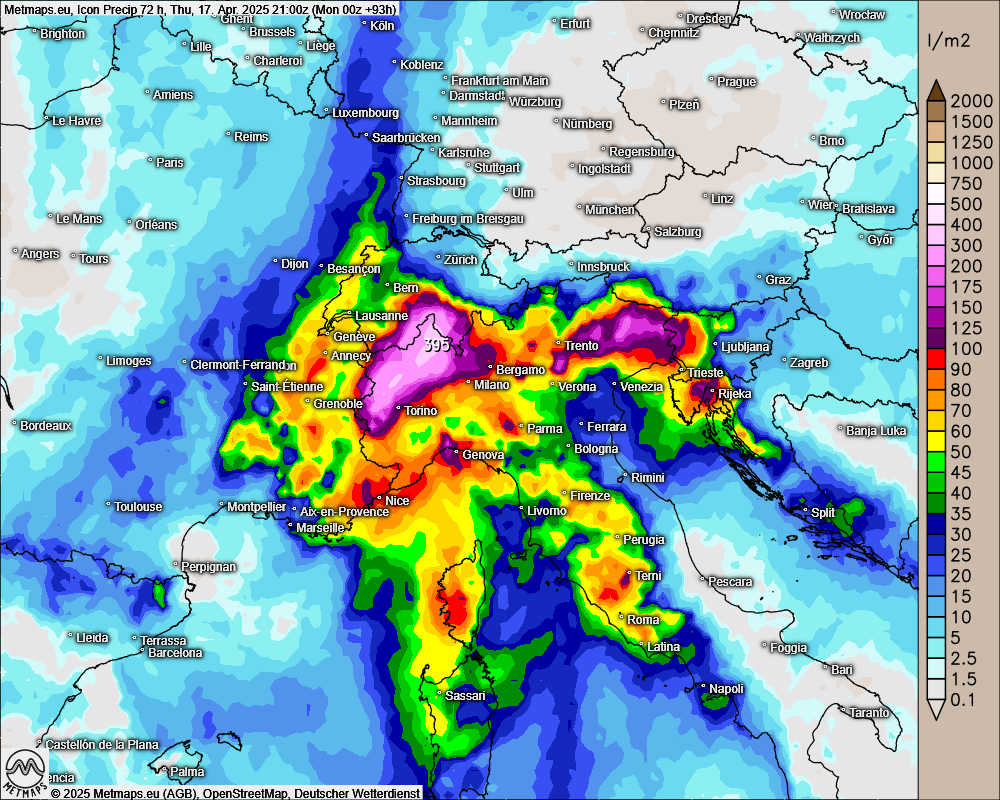 Vor allem wer die Karwoche in Norditalien oder der südlichen Schweiz verbringen wird, sollte maximal regenfest sein: Bis Karfreitag muss hier mit unwetterartigen Regenmengen (je nach Modelllauf zwischen 300 und 400 l/m²) und kräftigen Gewittern gerechnet werden. Hochwasser ist möglich - und zumindest lokal - auch Sturzfluten.