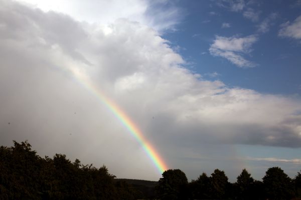 Am Abend zeigt sich an vielen Stellen in Deutschland nach den Schauern und Gewittern ein Regenbogen. Er versöhnt uns mit dem heftigen Wetter der letzten Stunden. Die Aufnahme entstand am Donnerwetter.de Wetterpark am Abend in der Eifel.