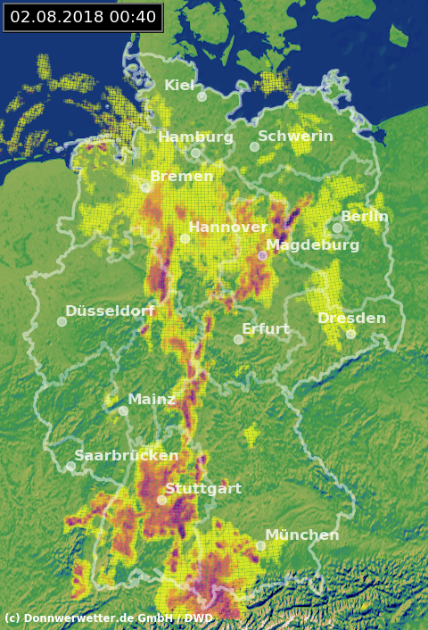 Das Radarbild zeigt aktuell teils stärkeren Schauer- und Gewittersignalen, die langsam nach Osten wandert. Mit etwas Phantasie erkennt man an Hand der Cluster den Buchstaben „X“. Sonst präsentiert sich der Himmel über Deutschland teils wolkenverhangen, teils sternenklar oder nur leicht bewölkt.