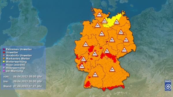 Ab heute Vormittag, über den Mittag bis in den Nachmittag hinein stehen dann Sturmböen auf dem Programm: Von NRW bis ins Erzgebirge hinein sind dann Böen bis zu 100 km/h möglich. Auf den Höhen und in freien Lagen sind auch einzelne Orkanböen nicht auszuschließen.