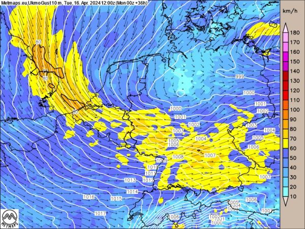 Heute Nachmittag etwa sind in der gesamten Westhälfte bis runter in den Schwarzwald Böen bis 80-85 km/h möglich. Da die Bäume belaubt sind, kann auch mal ein Ast brechen.