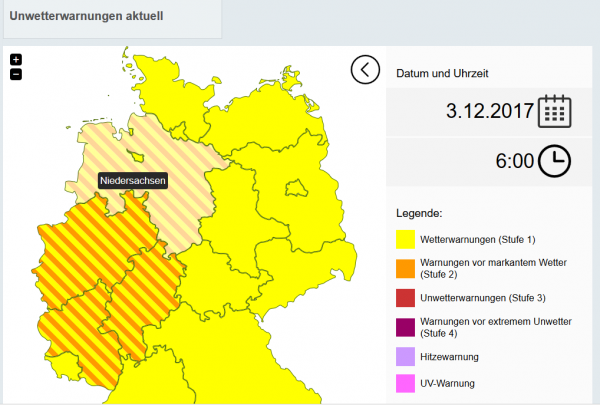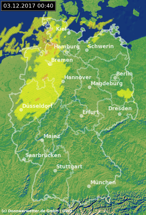 Das Radarbild zeigt aktuell im Nordwesten leichte bis mäßige Signale. Hier fällt bereits schon Schnee, im Küstenbereich bei Temperaturen leicht über dem Gefrierpunkt auch Regen oder Sprühregen. Sonst ist der Himmel über Deutschland überwiegend wolkenverhangen, aber auch gebietsweise aufgeklart. Vereinzelt haben sich Nebelfelder gebildet.