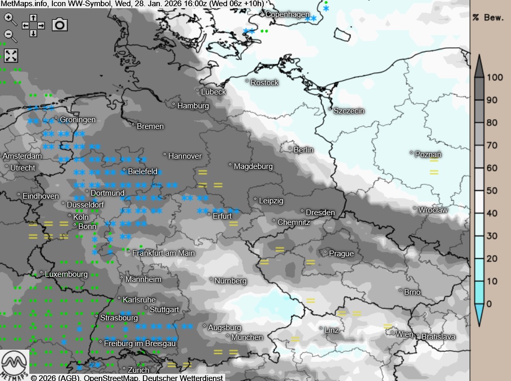 In den späten Nachmittagsstunden setzt von Südwesten her Schneefall ein, der sich in der Nacht sowie im Verlauf des Donnerstags nordostwärts bis in den zentralen und östlichen Mittelgebirgsraum ausbreitet.