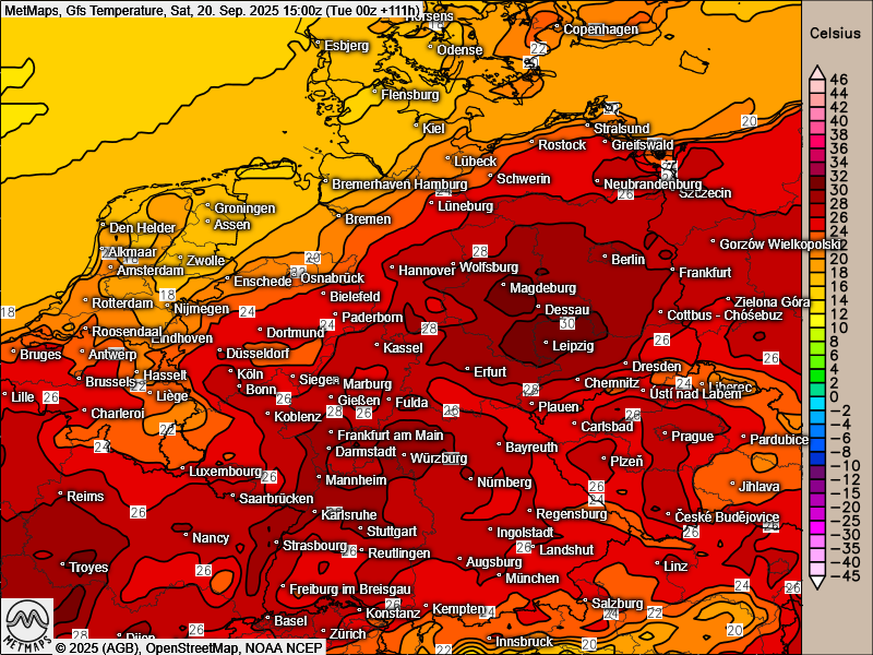 Am Samstag geht es mit den Temperaturen noch ein Stück nach oben: Für Berlin und Dresden könnte es mit Spitzenwerten von 30 bis 32 Grad sogar nochmals einen Hitzetag geben: